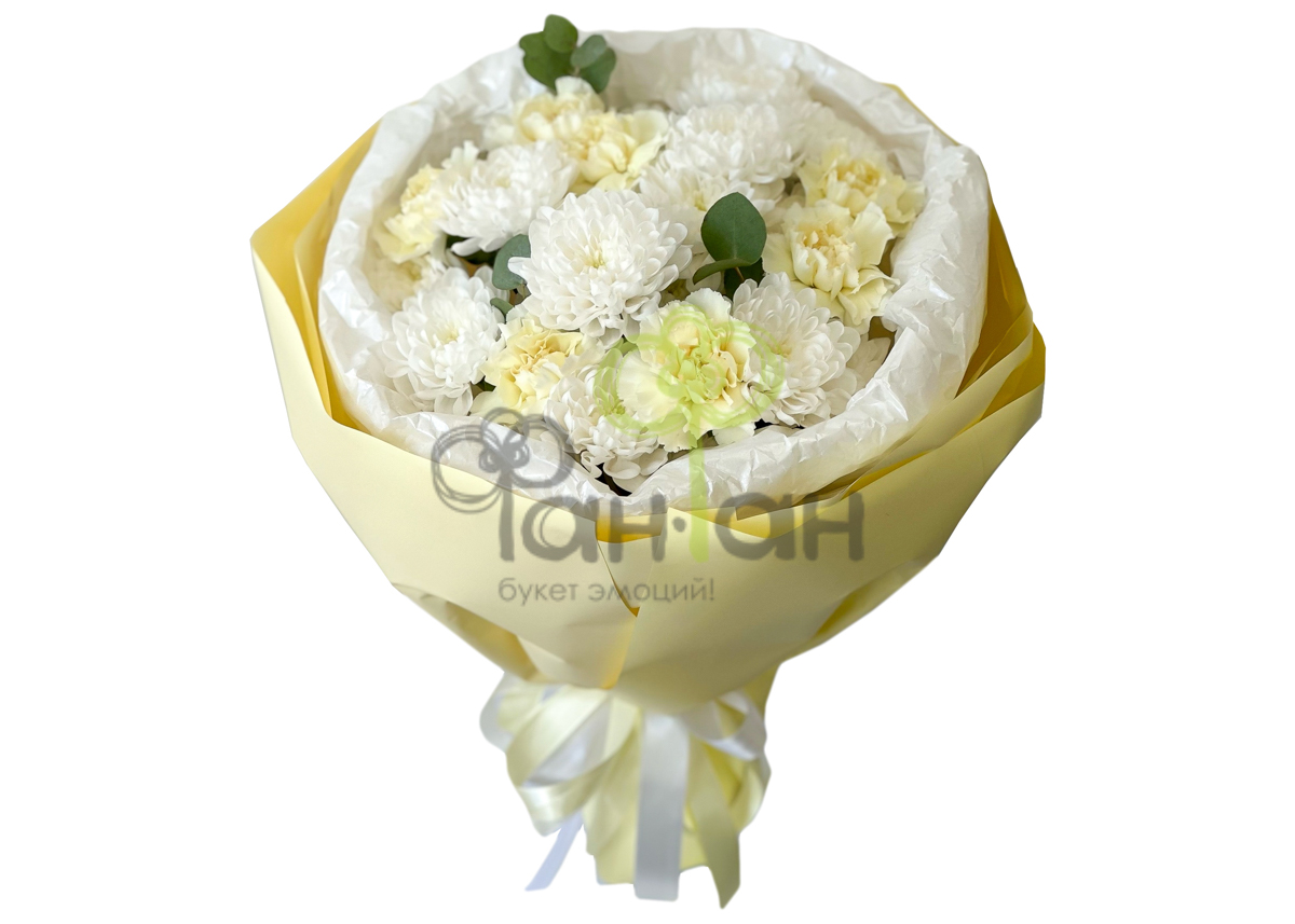 Стильный букет в бело-лимонной гамме, с гвоздикой и хризантемой.